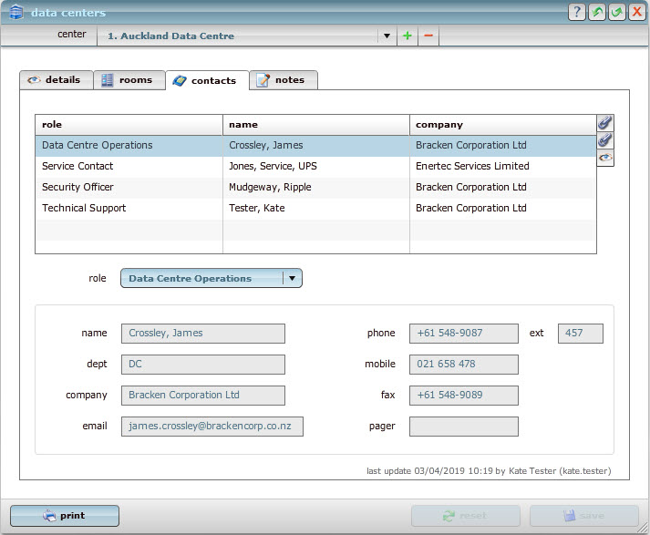 Example 2. The Data Center manager needs to know who is responsible for servicing the air conditioning in one of his centers. CENTEROS has contacts listed by data center according to their services for example fire, cabling and equipment providers.