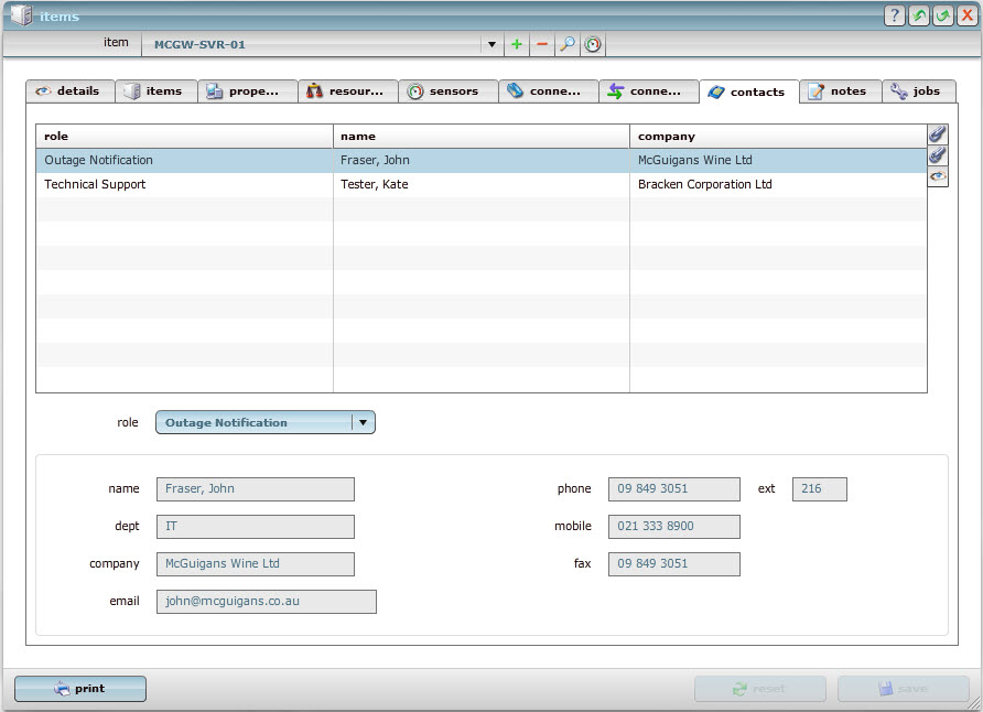 When a customer is created the contacts, equipment and jobs are tracked on that customer’s form. Every piece of equipment can have many different types of contacts linked to it. The contact role is a customizable field so you can add your own specific contact names like Outage Notification, Prime Contact and Technical Owner.